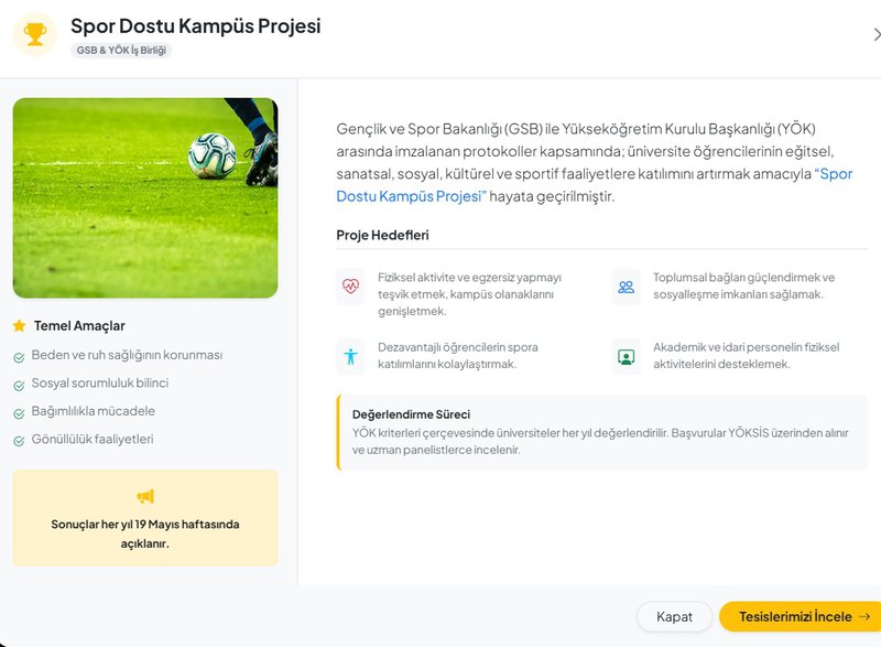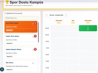 Üniversitemiz Spor Bilimleri Fakültesine bağlı spor tesislerinin, Spor Dostu Kampüs Projesi kapsamında daha etkin, düzenli ve erişilebilir şekilde kullanılabilmesi amacıyla, GÜMEKSİS sistemi üzerinden rezervasyonlar aktif hale getirilmiştir.