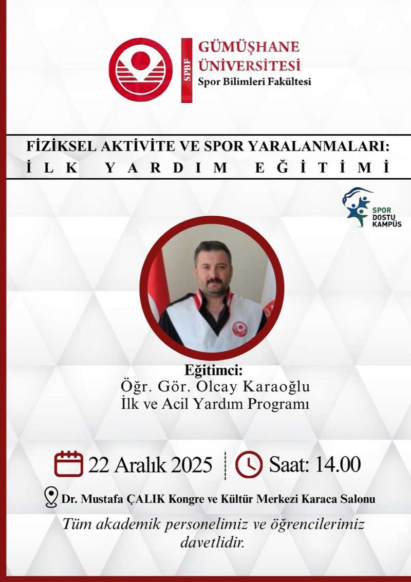 Gümüşhane Üniversitesi tarafından düzenlenen “Fiziksel Aktivite ve Spor Yaralanmaları: İlk Yardım Eğitimi”, spor ortamlarında karşılaşılabilecek yaralanmalara doğru ve etkili ilk yardım müdahalelerini ele almak amacıyla gerçekleştirilecektir.